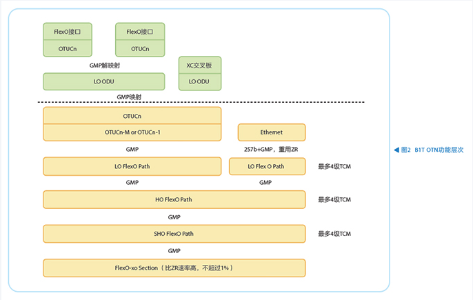除了承载以太网,B1T OTN还保持了后向兼容性,能够支持传统的OTN接口中的ODU业务在B1T OTN网络的承载。为了实现高效业务承载以及保持B1T OTN 100G时隙粒度的大颗粒调度,可以基于OTUCn作为多个低速ODU业务汇聚的实体,通过一些降速技术实现到新的FlexO路径层的映射。整个B1T OTN网络的功能架构如图2所示。