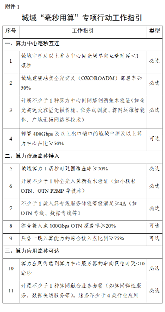 聚焦算力网络发展,构建高速大容量、确定低时延、泛在广覆盖的城域网络,在城域内提供毫秒级算力资源网络通达能力,即面向基础设施实现算力中心毫秒互连(<1毫秒),面向重点场所实现算力资源毫秒接入(<1毫秒),面向应用终端实现算力应用毫秒可达(网络时延<10毫秒)。以专项行动为牵引,带动产业各方聚焦畅通毫秒用算通道,在全国范围内梯次推进毫秒用算网络建设,到2027年基本形成全域覆盖、高效畅通的城域毫秒用算网络能力体系。